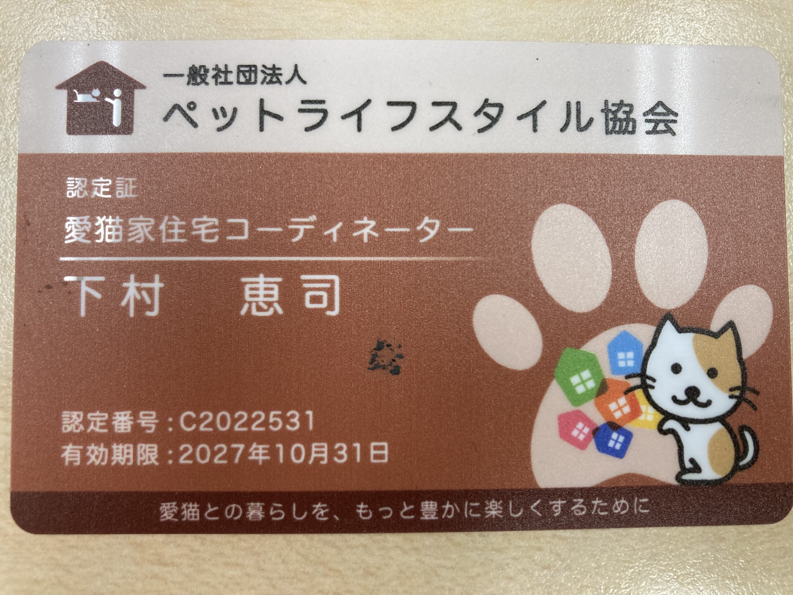 2025.11.06 下村 分譲スタッフ 資格 ショウワグループの下村です。 このたび、資格を取得することが出来ました! こちらの資格です↓ 愛猫家住宅コーディネーターとは、 愛猫と人間が、安全で快適に過ごせる住まいのご提案をさせていただく資格 となっております。 ペットは家族同然ですからね、、、 私のほかに社内には愛犬家コーディネーターもおりますので、 愛猫家住宅、愛犬家住宅にご興味のある方はお気軽にお問い合わせください 前の記事へ 一覧に戻る RELATED ARTICLE 関連記事 お引渡し!! ゴールデンウィーク ストークガーデン津島南 新プラン完成! 最新記事 2025.11.06 資格 2025.10.27 平屋の家が完成しました。 2025.10.25 イメージが広がる♪小山モデルに家具を設置しています