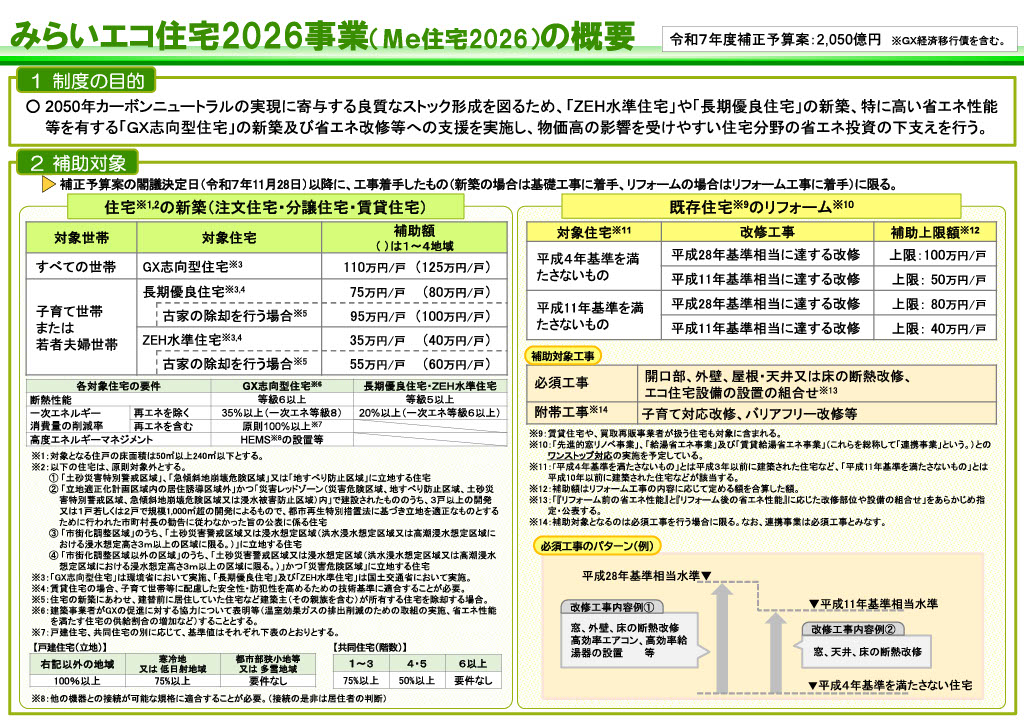 来年度の補助金の「みらいエコ住宅2026事業」概要が発表されました
