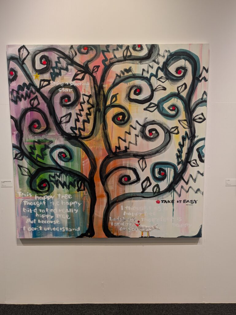 大胆な色の組み合わせや、迷いのない筆致に驚かされました。明るい作品が多いので、お子様と一緒に