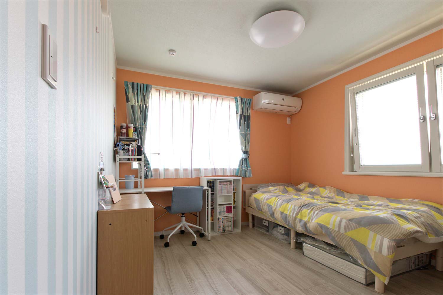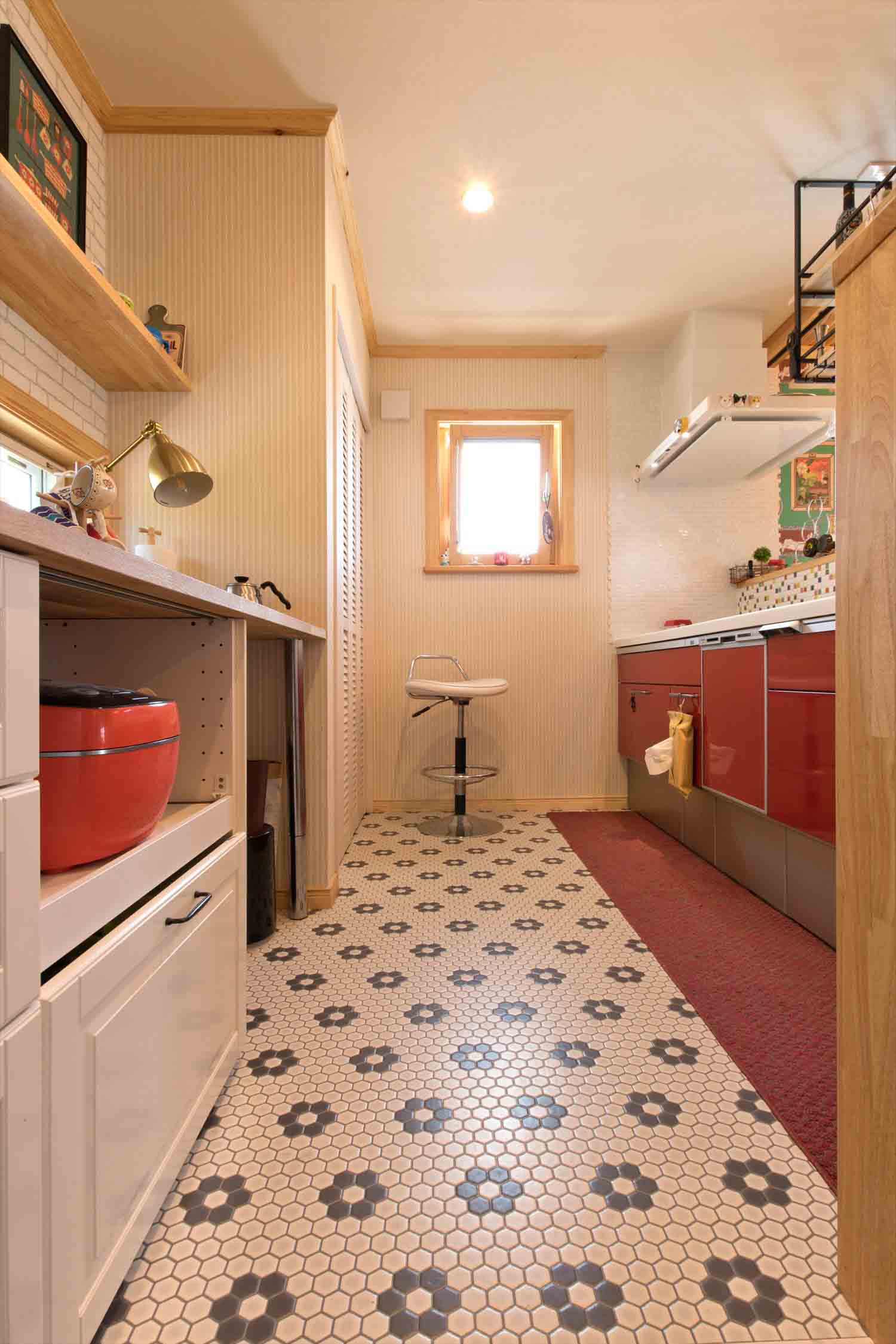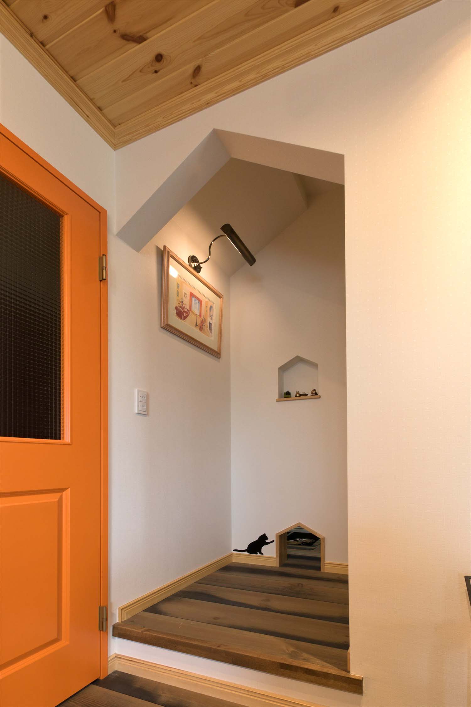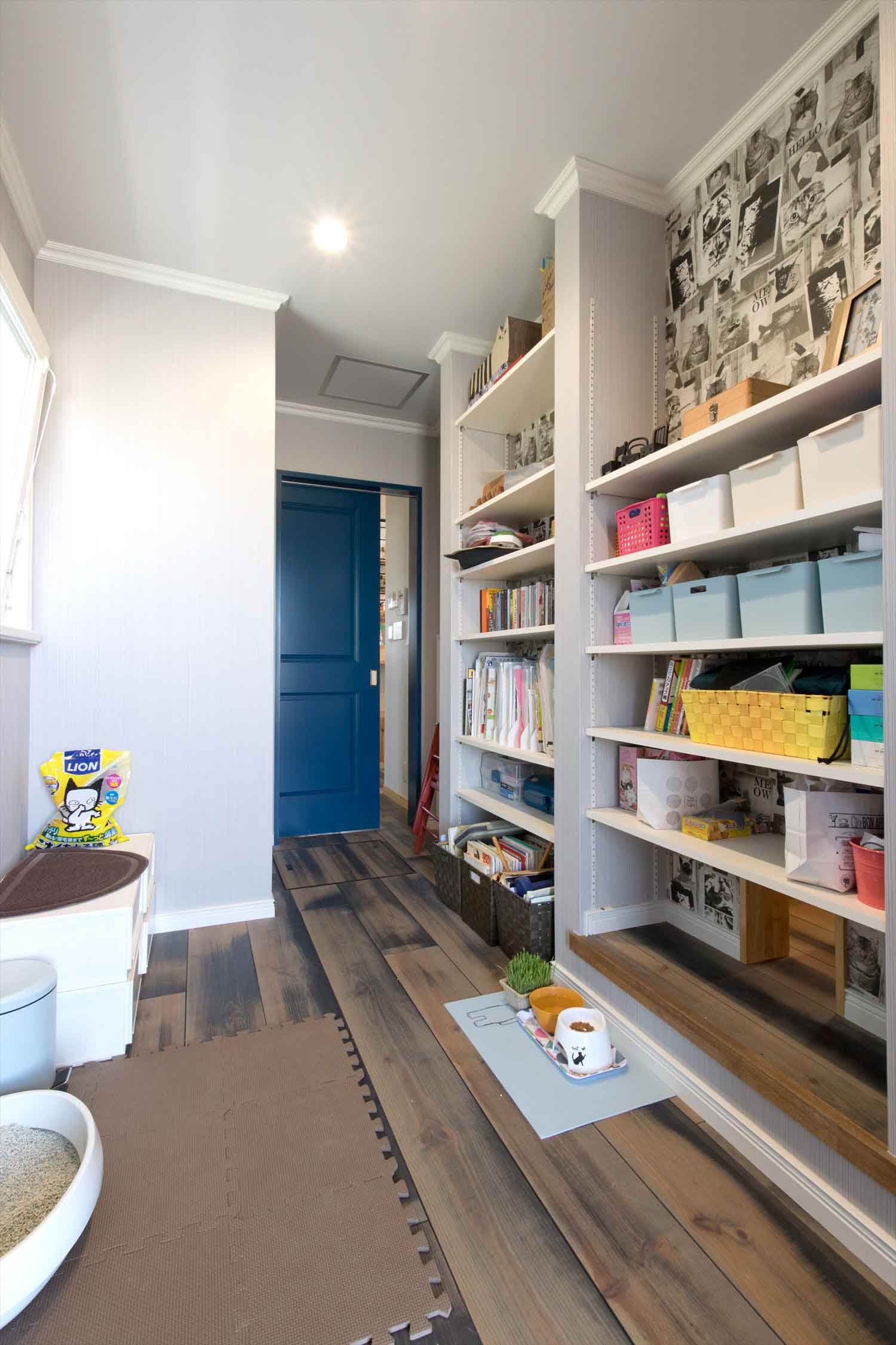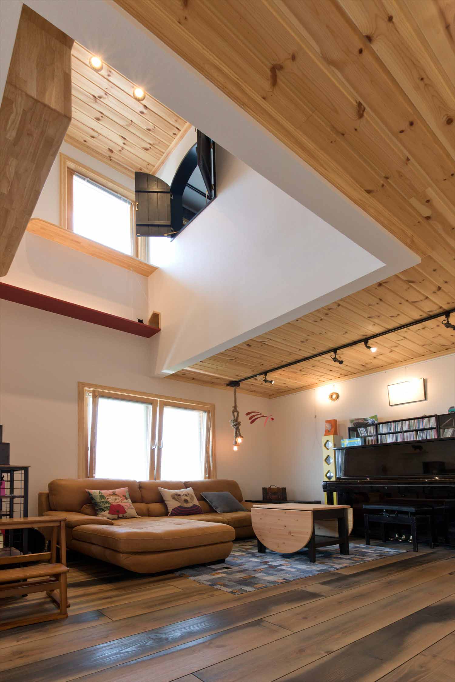 深い軒と広々としたベランダが水平ラインを美しく引き立て、まるで海外の街並みのような佇まいです。室内には、音楽を愛するご家族のセンスが随所に感じられ、キャットウォークや猫用トンネルなど、ペットとの暮らしを楽しむ工夫もいっぱい。赤とブルーをアクセントにした遊び心あふれる空間は、毎日の生活を少し特別にしてくれる、心豊かな北欧の暮らしを体現したお住まいです。