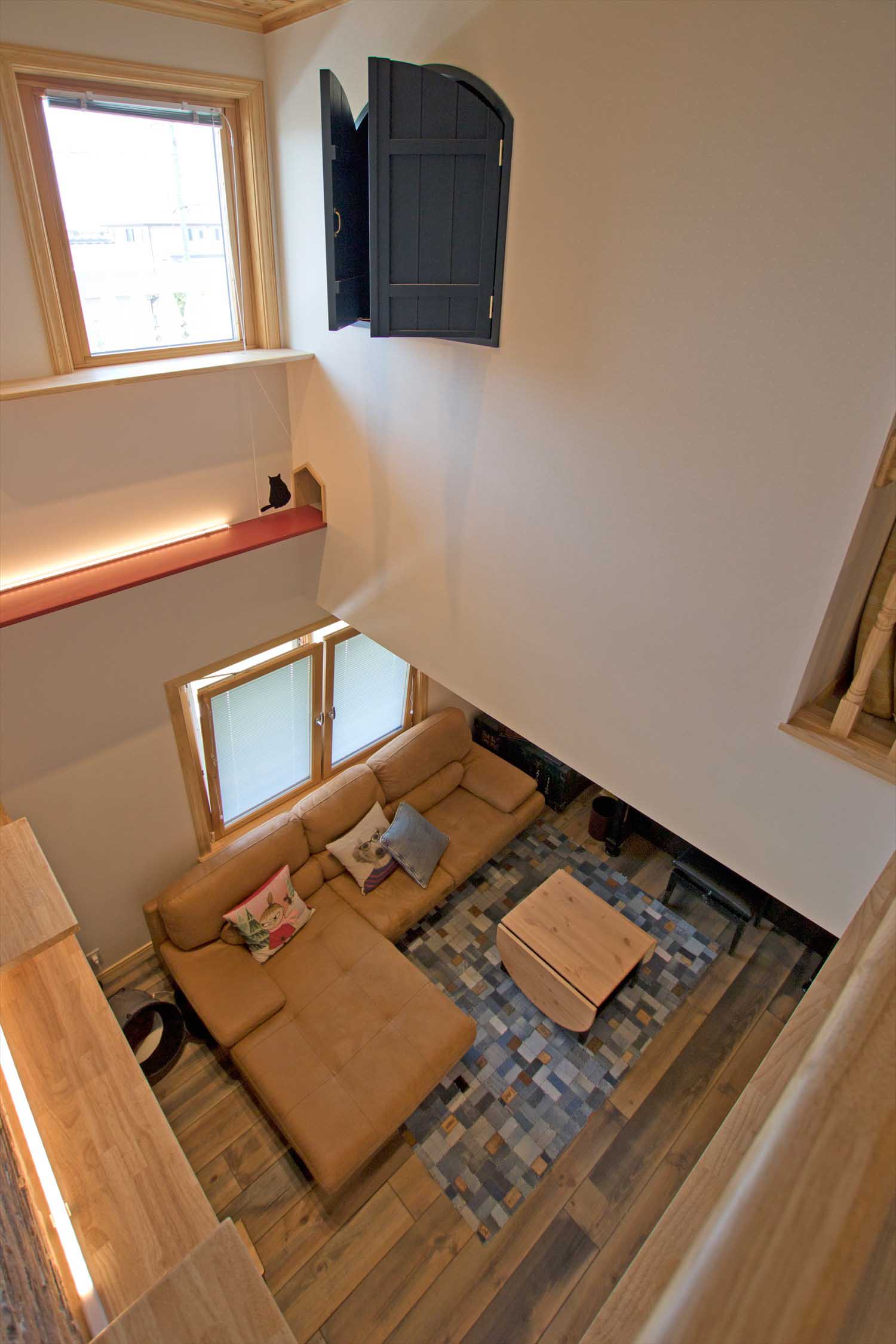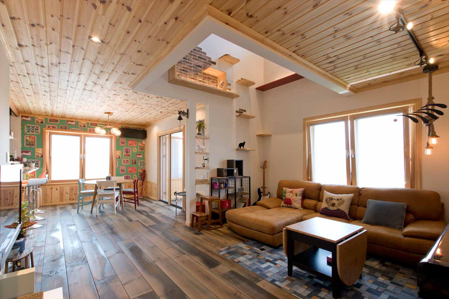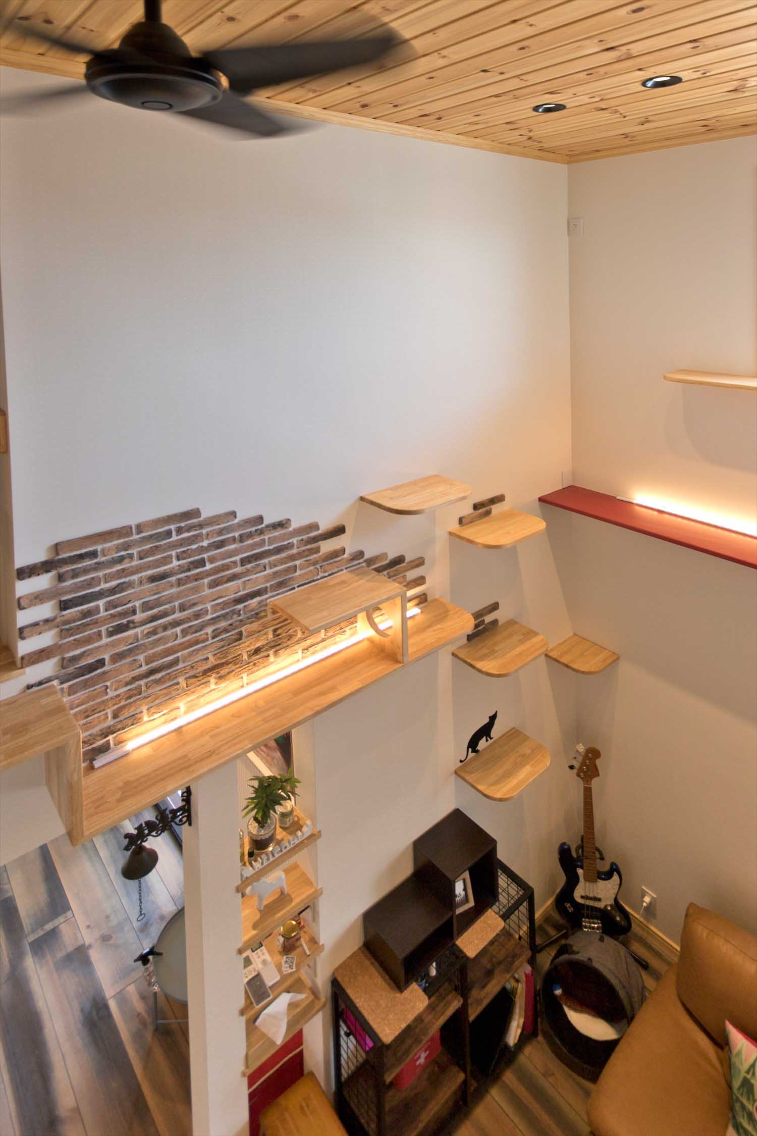 リビングにはキャットウォークと楽器のディスプレイ。まるでカフェのような非日常感です。