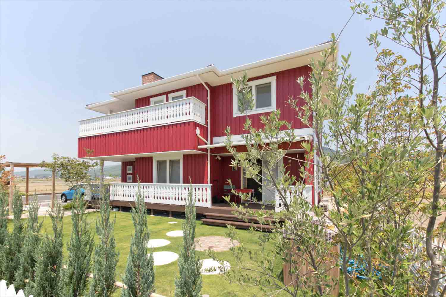 青空に映える真っ赤な外観が印象的な、北欧スタイルのスウェーデンホーム。