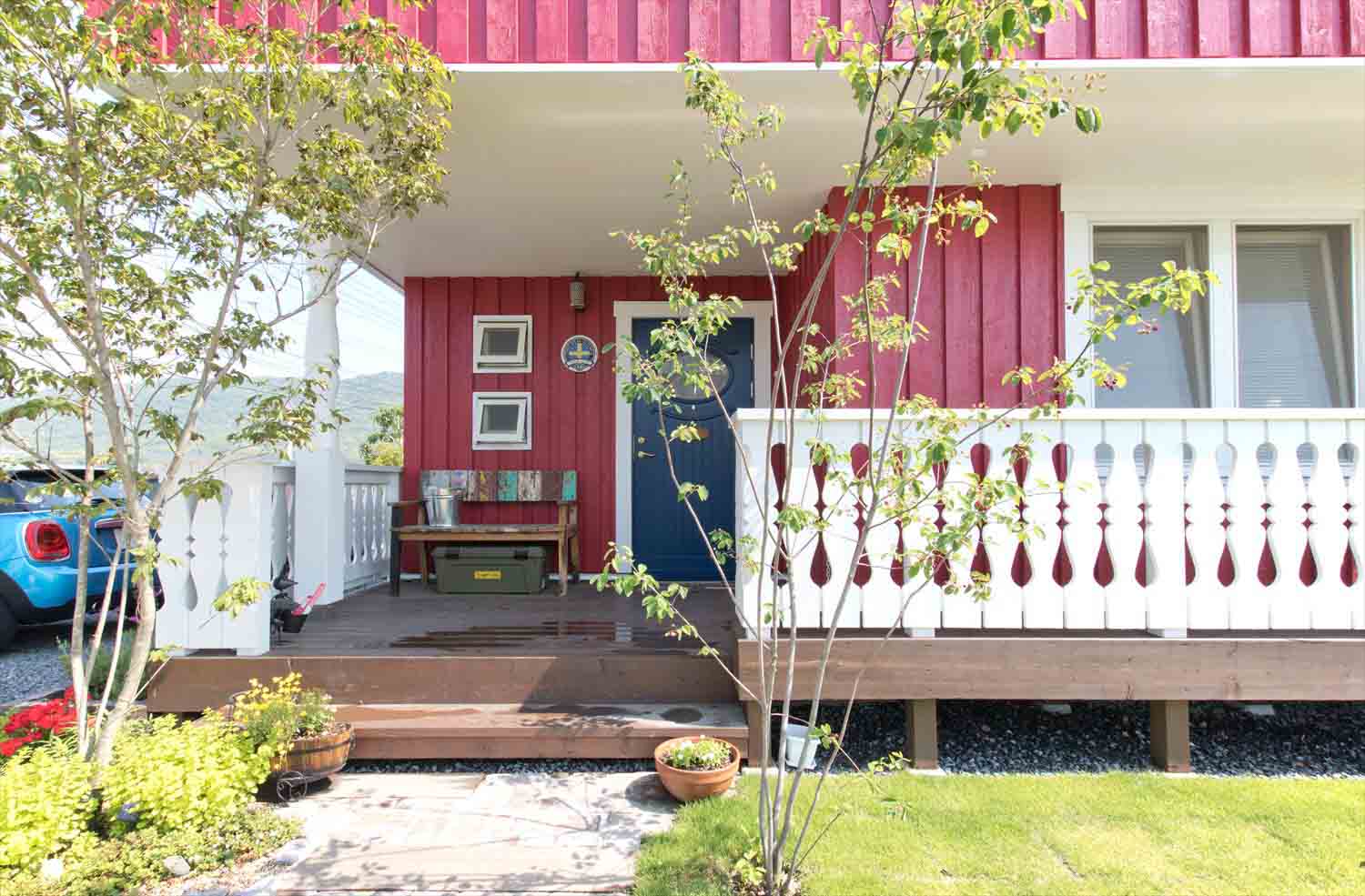 深い軒とワイドなベランダが印象的。青空に溶け込むような鮮やかな赤い外観は、まるで北欧の街並みに迷い込んだよう。