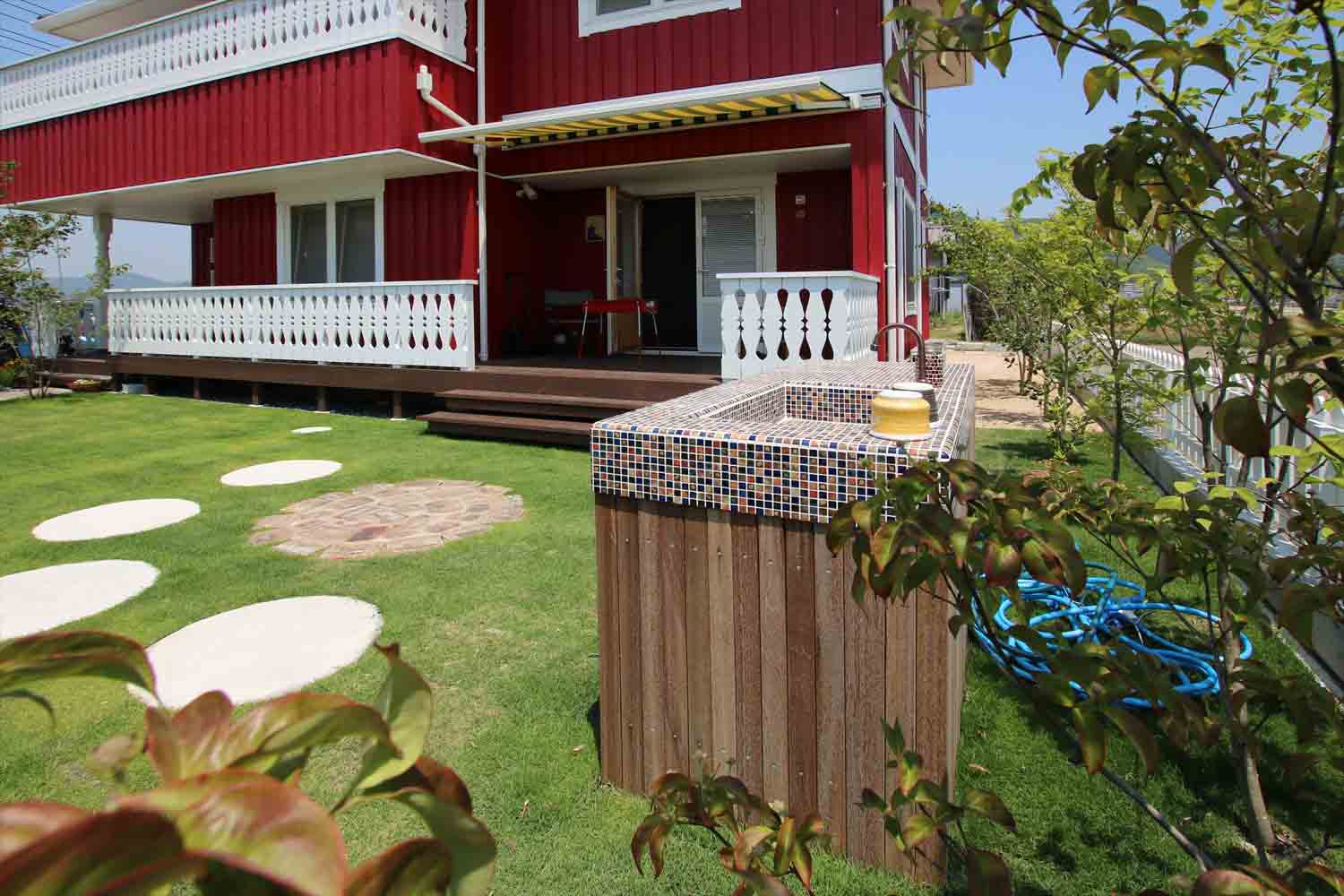 モザイクタイルが可愛い屋外キッチン。バーベキュー好きのご家族にはたまらない空間です。
